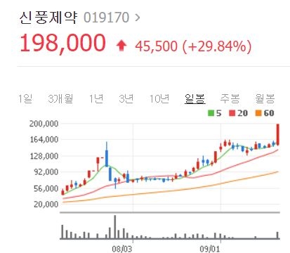 신풍제약은 이날 29.84% 오른 19만8000원 상한가이자 52주 신고가에 마감했다. 이날 15만3000원에 출발해 두자릿수 급등하더니 그 상승폭도 점차 커졌다. 오후 2시께 전 거래일(15만2500원)보다 28.52% 오른 19만6000원에 거래됐다.