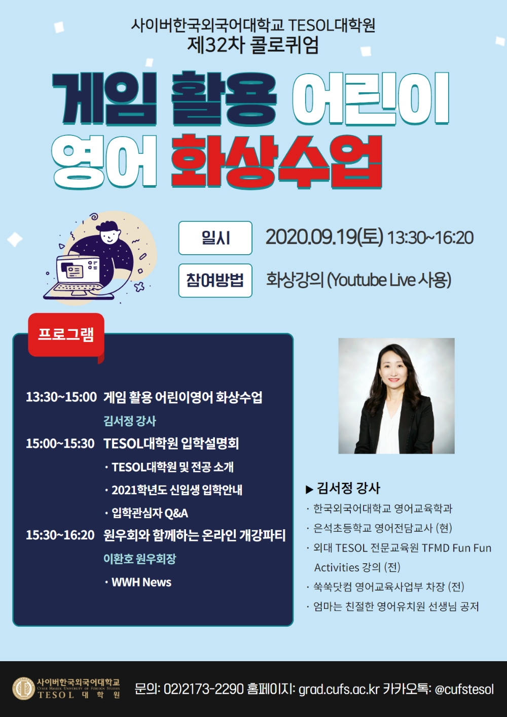 사이버한국외대 TESOL대학원 제32차 콜로퀴엄은 ‘게임 활용 어린이 영어 화상수업’이라는 주제로 COVID-19로 큰 변화를 맞고 있는 영어 공교육 현장과 새로운 교육환경에 효율적으로 대처할 수 있는 교수방법에 대한 전문가 특강을 진행했다.