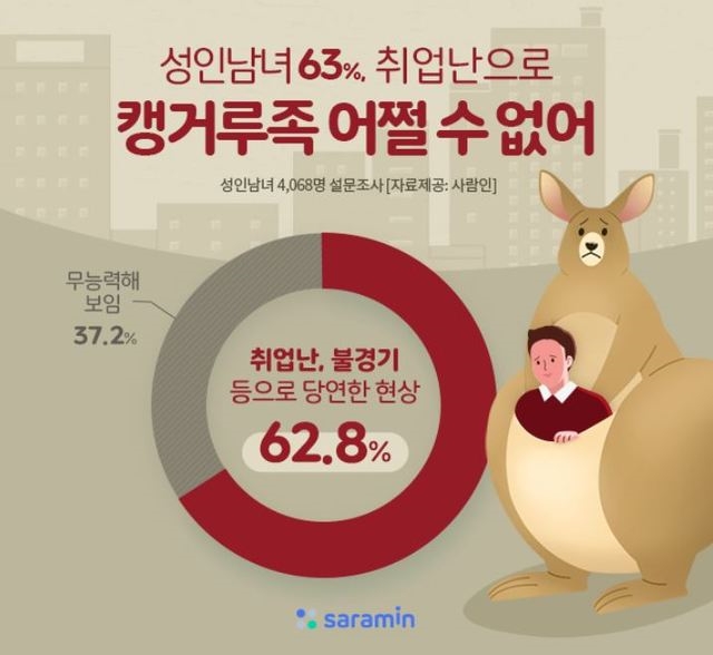 이미지 확대보기구인구직 매칭 플랫폼 사람인이 21일 성인남녀 4068명을 대상으로 ‘코로나19 시대, 캥거루족에 대한 생각’을 물은 결과, 62.8%가 ‘캥거루족은 취업난과 불경기 등으로 당연한 현상’이라고 인식하고 있는 것으로 나타났다.