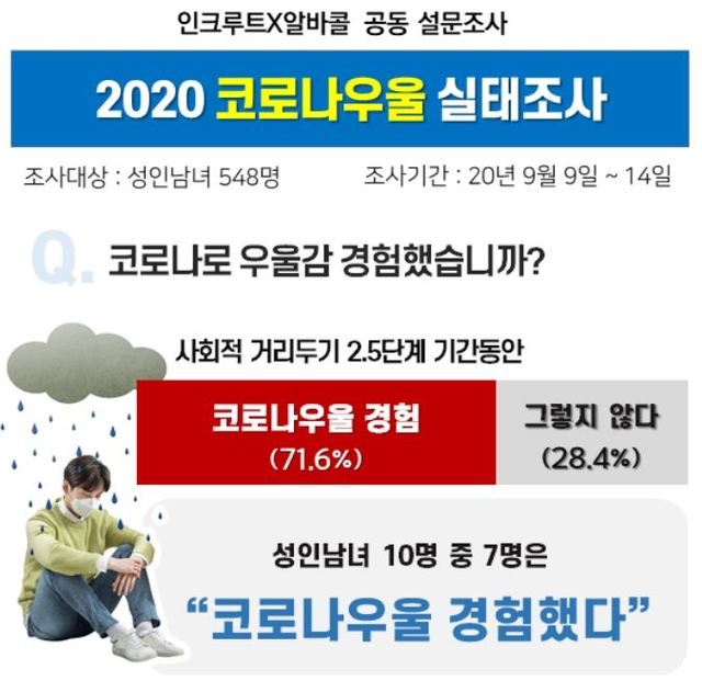 이미지 확대보기취업포털 인크루트와 비대면 알바채용 바로면접 알바콜이 21일 성인남녀 548명을 대상으로 조사한 결과, 이른바 ‘코로나 블루’를 경험했다는 응답이 71.6%에 달한 것으로 나타났다.