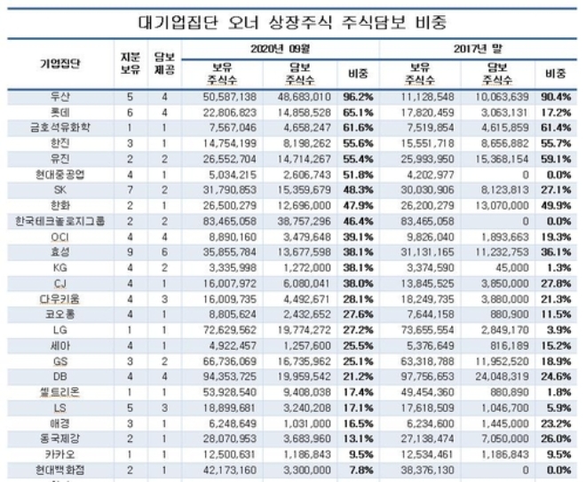 오너일가의 주식 담보 비중이 가장 높은 그룹은 두산으로, 보유 주식의 96.2%를 담보로 제공한 것으로 분석됐다.