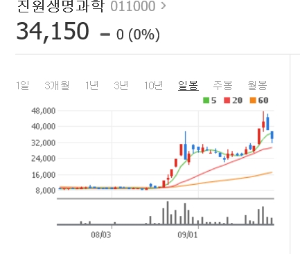 최근 진원생명과학의 주가가 뜀박질하고 있는 가운데 시가총액이 대형제약사인 종근당을 추월했다.