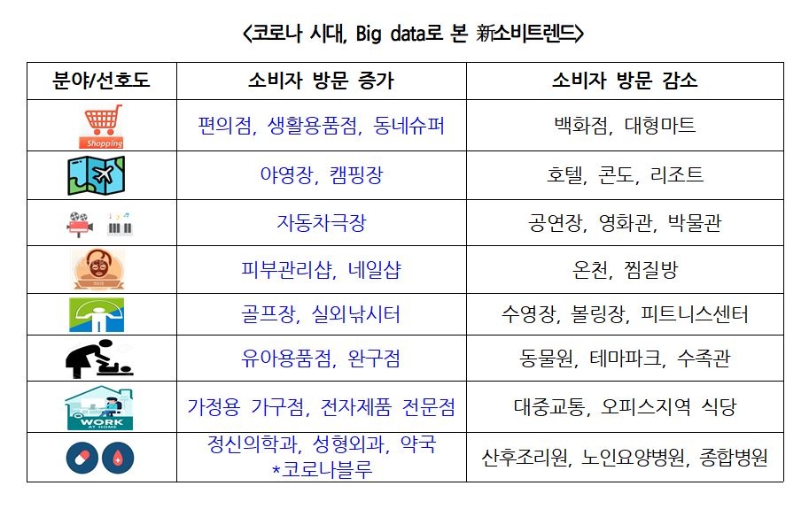 코로나19의 확산으로 실내 시설에서 이루어지는 소비가 줄고 실외·소규모시설의 소비는 상대적으로 늘어나는 등 업종별로 명암이 엇갈리고 있는 것으로 분석됐다.