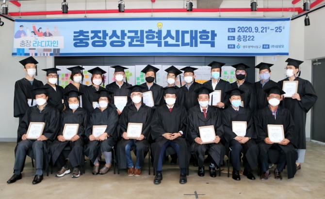 이미지 확대보기지난 21일부터 5회에 걸쳐 충장22에서 운영된 충장상권혁신대학 ‘충장리:디자인’은 25일 수료식을 가졌다. 이날 수료식에 참석한 교육생 20명은 향후 충장로 4~5가 미래를 준비하고, 충장로의 번영과 발전을 이끌어낼 수 있는 ‘혁신적인 리더’가 되겠다는 포부를 밝혔다.