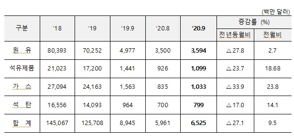 이에 따라 수입금액도 줄어들 수밖에 없었다. 원유 도입금액은 2018년 803억 9300만 달러에서 지난해 702억5200만 달러로 감소했다. 월별로는 지난해 9월 49억 7700만 달러,올해 8월 35억 달러, 9월 35억 9400만 달러를 나타냈다.
