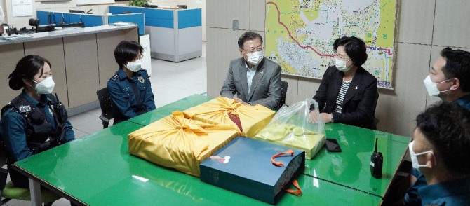 문 대통령 내외는 준비해간 과일과 떡, 한과 등을 전달한 뒤 근처에 있는 신교 119안전센터로 이동했다.