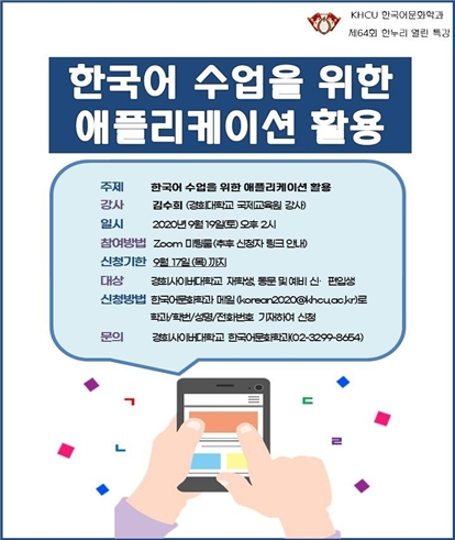 지난 6월 시작된 코로나 19시대의 온라인 한국어 교육을 탐색을 위한 학과 특성화 프로그램의 세번째 시간으로 마련된 이번 특강은 경희대학교 국제교육원과 경희사이버대학교 한국어학과의 수업을 담당하고 있는 김수희 교수가 ‘한국어 수업을 위한 애플리케이션 활용’이라는 주제로 강연을 진행해 큰 호응을 얻었다.