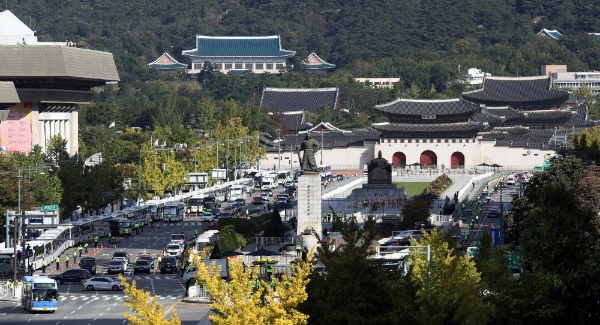 이미지 확대보기이날 경찰에 따르면 오전 서울 종로구 광화문광장과 중구 시청광장 등 일대에는 경찰 차벽과 울타리 등 물리적 차단 장비가 대거 배치됐다. 차벽은 도로와 인도 경계를 막는 방식으로 설치됐고, 인도에도 폴리스라인이 들어섰다.