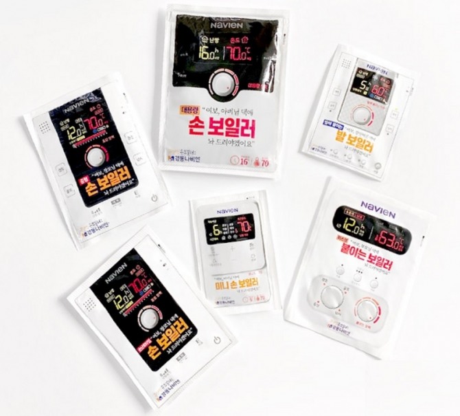 CU 편의점에서 만날 수 있는 경동나비엔 방한용품 1호는 핫팩으로, '국가대표 콘덴싱 손 보일러'라는 광고 카피와 함게 총 6종 디자인으로 출시됐고, 경동나비엔 보일러의 실내온도조절기 문양을 적용했다.