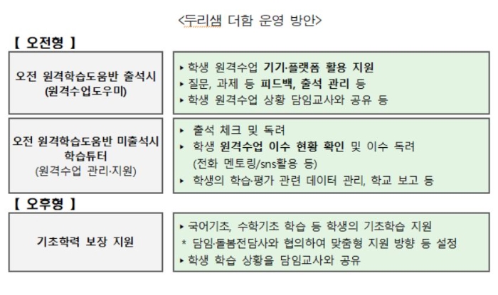 '오후형'의 경우에는 원격수업에서 부과된 과제 해결, 기초학습 지원 등 학생의 학습 상황에 따른 학습 지원 활동으로 진행된다.