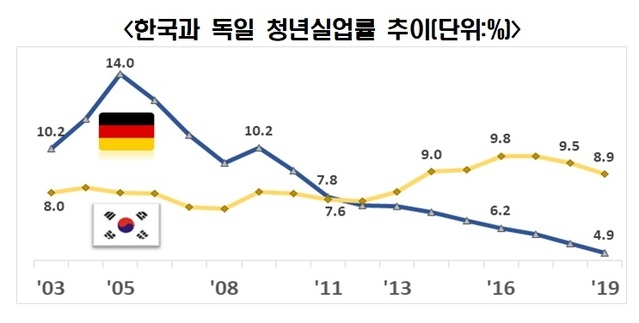 21일 한국경제연구원이 2003년부터 지난해까지 한국과 독일의 노동시장 유연성과 청년실업률을 분석한 결과, 독일의 노동시장 유연성 순위는 2003년 123개국 중 80위에서 2019년 162개국 중 38위로 42계단 올랐다. 반면 우리나라는 2003년 63위에서 2019년 144위로 81계단이나 추락한 것으로 나타났다.