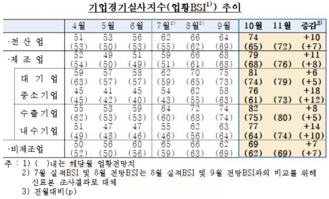 이미지 확대보기29일 한국은행이 발표한 ‘2020년 10월 기업경기실사지수(BSI)’에 따르면 이번달 전(全) 산업 업황 BSI는 전월보다 10포인트 오른 74로 나타났다.