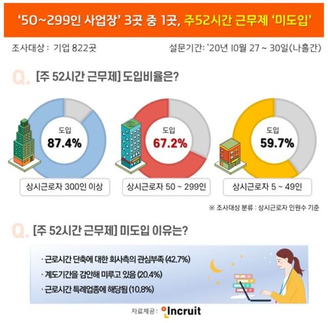 이미지 확대보기50~299인 중소기업에 대한 주 52시간 근무제 계도기간이 종료를 두 달 앞둔 가운데, 32.8%의 기업은 제도를 아직 도입하지 않은 것으로 나타났다.