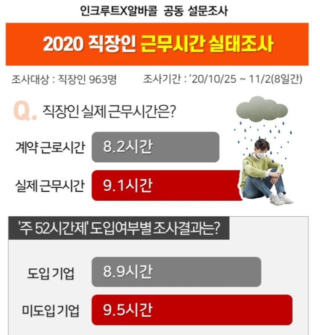 3일 취업포털 인크루트와 비대면 알바채용 바로면접 알바콜이 직장인 963명을 대상으로 설문한 결과, 이들이 밝힌 하루 평균 실제 근로시간은 9.1시간으로 집계됐다.