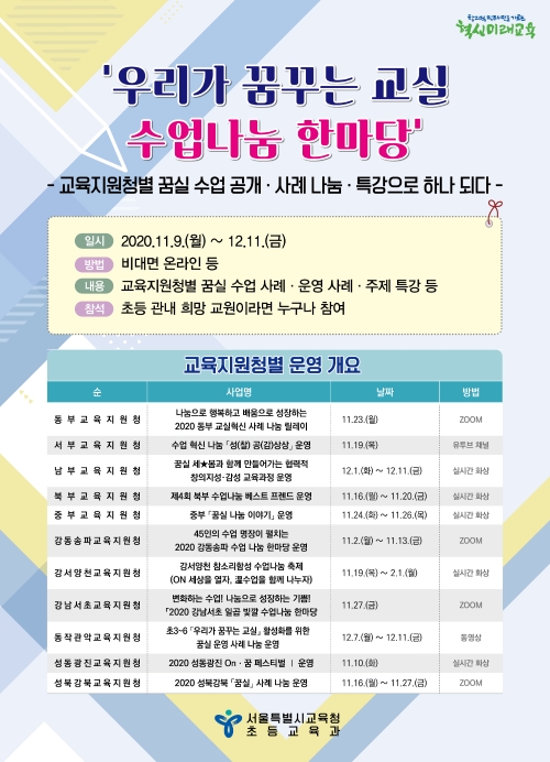 수업나눔 한마당은 9일부터 12월 11일까지 총 5주에 걸쳐 11개 교육지원청별로 비대면 온라인으로 운영되며, '꿈실(우리가 꿈꾸는 교실)' 운영 사례와 수업 공개, 특강 등의 내용으로 초등학교 관내 희망 교원이라면 누구나 참여할 수 있다.