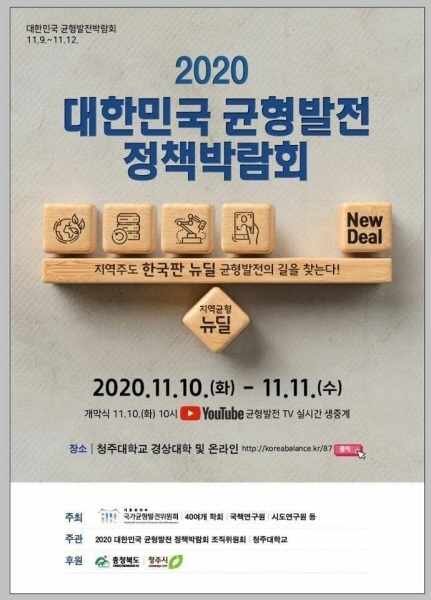 대통령직속 국가균형발전위원회(위원장 김사열 이하 균형위)는 오는 10일부터 11일 까지 청주시 청주대학교에서 ‘2020 대한민국 균형발전 정책박람회’을 개최한다고 밝혔다. 균형위에 따르면 청풍명월의 고장 청주에서 열리는 정책박람회는 2018년에 이어 3회째로, 코로나이후 국가균형발전정책의 중간점검과 향후과제 등에 대한 지식인들의 열린 토론장이다.