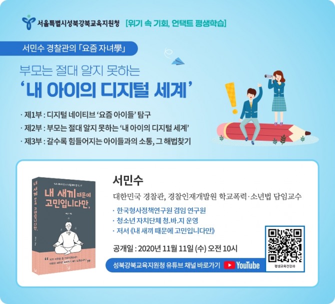 이번 강연은 경찰인재개발원 학교폭력·소년법 담임교수인 서민수 교수와 함께 ‘부모는 절대 알지 못하는 내 아이의 디지털 세계’라는 주제로 진행된다.