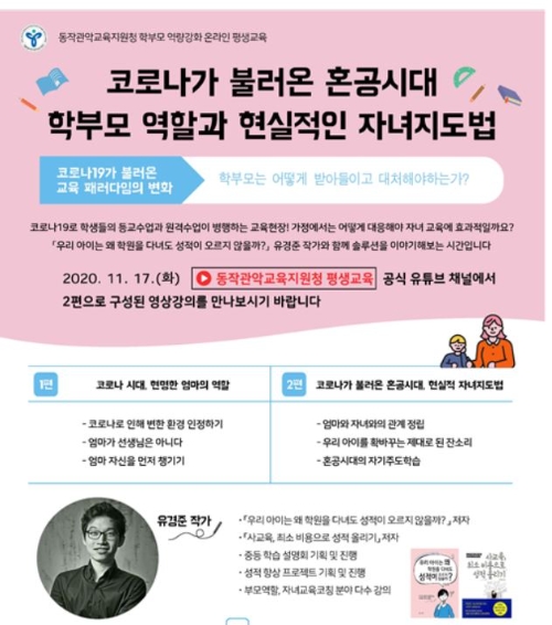 동영상 강의 시청 후 유 작가와 함께 하는 줌(ZOOM) 라이브 소통 ‘자녀교육 Q&A’를 별도로 운영해, 자녀교육 궁금증과 정보를 실시간으로 나누는 시간이 이어질 예정이다.