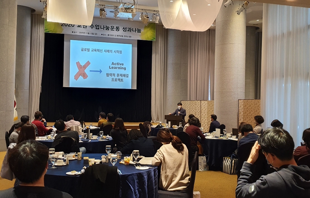 이미지 확대보기16일 시교육청에 따르면 연수에는 교원의 자발적인 공동체 문화를 이끌고 있는 수업나눔 동아리 회원 및 교육청 관계자 등 80여 명이 참여했다. 이번 연수는 올해 교원 수업나눔 운동 성과를 공유하고, 포스트 코로나 시대 미래 교육의 방향을 모색하는 내용으로 운영됐다.