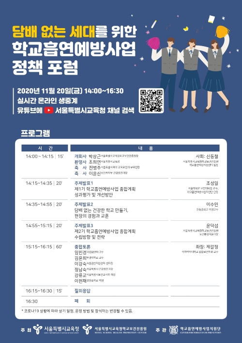 오는 20일 오후 2시에 열리는 포럼은 지난 5년간의 '제1기 학교흡연예방사업 종합 계획'의 운영 성과 및 문제점을 성찰해 보고, 향후 제2기 발전 방향을 토론하는 자리로써 주제발표, 종합토론, 질의응답 순으로 진행된다.