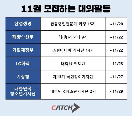 이미지 확대보기취업정보사이트 캐치는 20일 겨울방학을 앞두고 대학생들이 지원할 수 있는 대외활동을 소개했다.