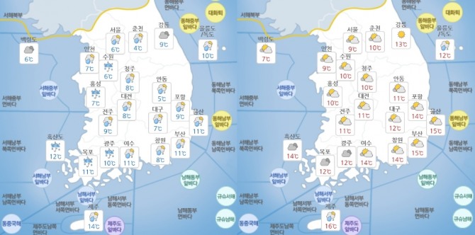 기온은 전날보다 5도 이상 높아져 아침 최저기온 3~11도, 낮 최고기온 9~15도 정도의 분포를 보이겠다. 지역별로 서울 6~9도, 인천 7~9도, 춘천 5~10도, 강릉 9~14도, 대전 7~11도, 전주 9~11도, 광주 10~12도, 대구 7~12도, 울산 9~14도, 부산 11~15도, 제주 14~16도를 나타내겠다.