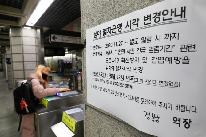 이미지 확대보기서울시의 '천만시민 긴급 멈춤 기간' 실행의 일환으로 대중교통 차원의 거리두기 방안 강화를 위한 오후 10시 이후 지하철 야간 운행 감축 시행을 하루 앞둔 26일 오후 서울 종로구 서울지하철 3호선 경복궁역사에 지하철 야간 운행 감축 안내문이 부착돼 있다. 사진=뉴시스