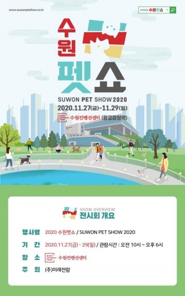 펫(애완동물) 박람회 ‘2020 수원펫쇼’가 27일부터 29일까지 수원컨벤션센터에서 열린다.(주)미래전람이 주최하는 이번 수원펫쇼는 사료·간식·의류 등 반려동물 관련 용품을 한자리에서 만나볼 수 있는 행사다. 전자출입명부 운영, 관람객 거리 두기 등 방역수칙을 준수하며 진행된다.