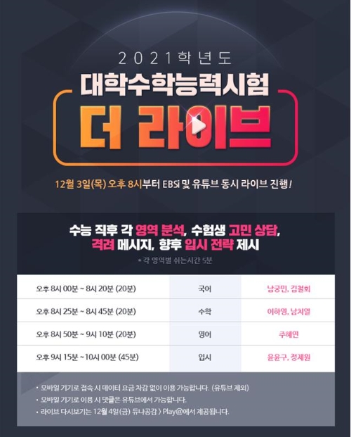 아울러 EBS는 수능 당일 저녁 8시부터 밤 10시까지 EBSi(www.ebsi.co.kr)와 유튜브(EBS고교강의)를 통해 '2021학년도 대학수학능력시험 더 라이브'를 진행한다. 특별 라이브 방송에서는 주요 과목에 대한 총평 및 출제 경향 분석, 연계 현황 분석을 제공한다.