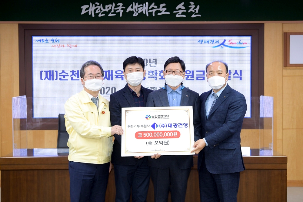 이미지 확대보기㈜대광건영은 순천시인재육성장학회에 13억원, 순천문화재단에 5억원의 후원금을 전달해, 이날 모두 18억원을 순천시 발전을 위해 기부하였다.