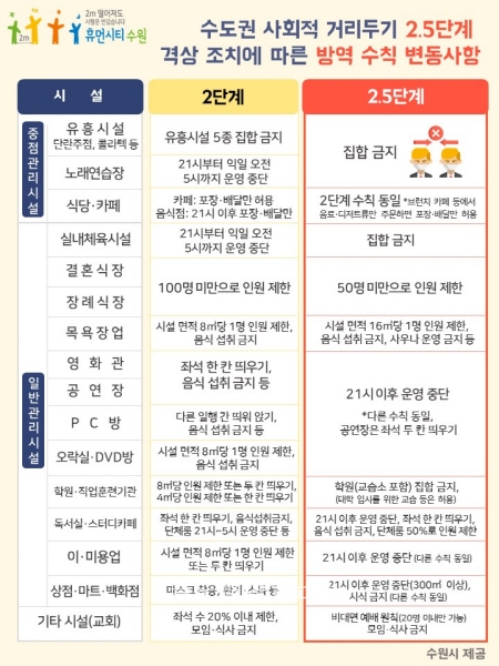 중점관리시설은 한 번이라도 방역수칙을 위반하면 바로 ‘집합금지’ 조치하는 ‘원스트라이크 아웃제’를 적용하고, 일반관리시설은 방역 수칙을 위반하면 강력하게 행정 제재를 한다. 수원시는 지속해서 현장 점검을 하며 변경된 방역 수칙을 안내할 예정이다.