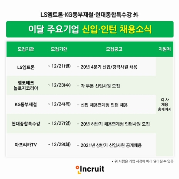 이미지 확대보기인크루트는 이달 중 주요 기업의 대졸 신입과 인턴 채용 소식을 18일 발표했다.
