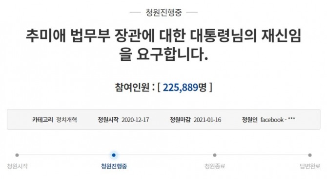 청와대 국민청원 홈페이지에 따르면 19일 오전 9시 현재 '추미애 법무부 장관에 대한 대통령님의 재신임을 요구합니다'는 제목의 청원 글에 22만5889명이 동의한 것으로 나타났다.