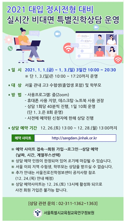 또한 수시 충원 합격 등으로 상담 취소 및 불참자가 발생하는 경우, 상담 대기자 명부를 작성하여 대기 순번에 따라 최대한 많은 상담 기회를 제공할 예정이다. 온라인 예약 및 상담 유의사항은 서울진로진학정보센터 누리집 공지사항에서 확인할 수 있다.