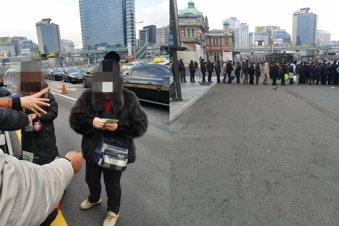 이미지 확대보기22일 서울 남대문경찰서에 따르면 이날 낮 12시30분 서울역 1번 출구 앞 서울역 광장에서 여성 3명이 노숙자들에게 현금과 양말을 나눠준 것으로 알려졌다.