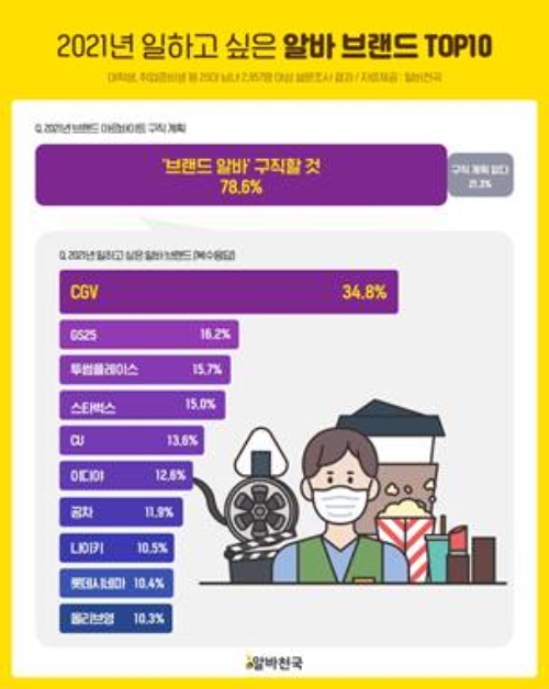 실제로 일하고 싶은 알바 브랜드는 ‘CGV’가 34.8%(복수응답)로 1위를 차지했다.