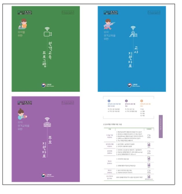 아울러 '유아를 위한 원격교육 프로그램'을 위한 '교사 지원자료', '부모 지원자료'도 함께 제작하였다. '교사 지원자료'는 원격교육을 위한 준비 자료와 디지털 자료 활용 및 소통하기 등으로 구성되며, '부모 지원자료'는 가정에서 원격교육 지원을 위한 준비와 정서지원, 올바른 미디어의 사용 방법 등을 담았다.