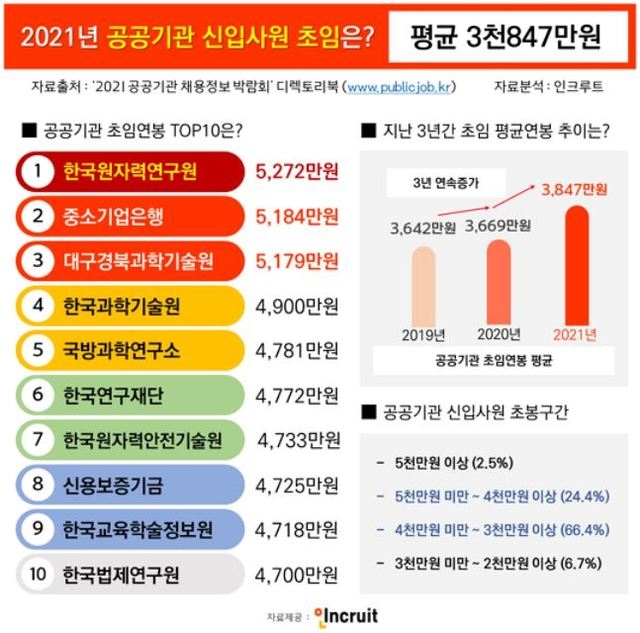 취업포털 인크루트와 알바콜이 19일 ‘2021 공공기관 채용정보 박람회 디렉토리북’에 게재된 148개 기관의 신입사원 연봉을 분석한 결과, 31개 공기업과 71개 준정부기관 등에서 올해 신입 초임을 밝힌 기관의 평균 연봉은 3847만 원으로 나타났다.