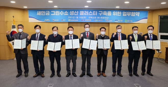 이미지 확대보기20일 한수원과 새만금개발청에 따르면, 19일 한수원은 전북도청에서 새만금개발청, 전북도, 군산시, 전북테크노파크, 현대로템, 두산중공업, 린데코리아, 한국특수가스와 '새만금 그린수소 생산 클러스터 구축을 위한 업무협약'을 체결했다.