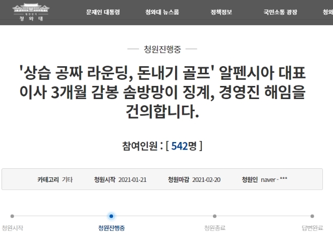 24일 업계에 따르면, 지난 21일 '상습 공짜 라운딩, 돈내기 골프 알펜시아 대표이사 3개월 감봉 솜방망이 징계, 경영진 해임을 건의합니다'라는 제목의 청와대 국민청원이 올라왔다.