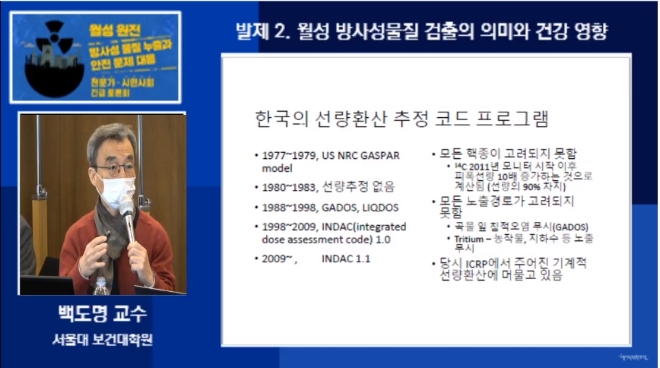 이어서 백 교수는 "우리나라는 물리적 에너지 수치를 생물학적 건강영향으로 환산해 보여주는 '선량환산' 추정 코드 프로그램이 모든 노출경로를 고려하지 못하고 있고 기계적 선량환산에 머물러 있다"고 말했다.