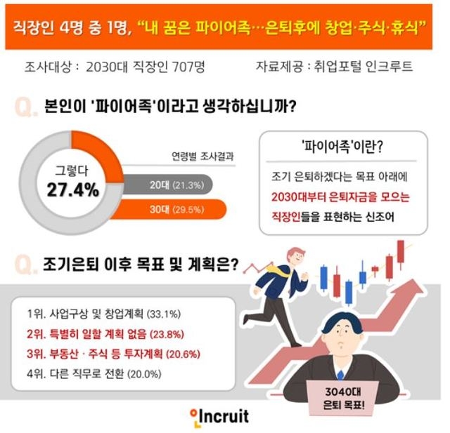 이미지 확대보기취업포털 인크루트가 4일 2030 직장인 707명을 대상으로 설문한 결과, 응답자의 27.4%가 스스로를 파이어족이라고 생각한다고 밝힌 것으로 나타났다.