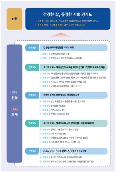 보고서는 코로나19 이후의 상황에 능동적으로 대응하기 위한 경기도의 비전을 ‘건강한 삶, 공정한 사회 경기도’로 제안했다. 비전에는 감염병, 재난, 환경오염, 사고로부터 위협받지 않는 건강한 삶터 경기도, 특권과 반칙, 구조적 불평등이 없는 공정한 사회 경기도를 지향하는 의지를 담고 있다.
