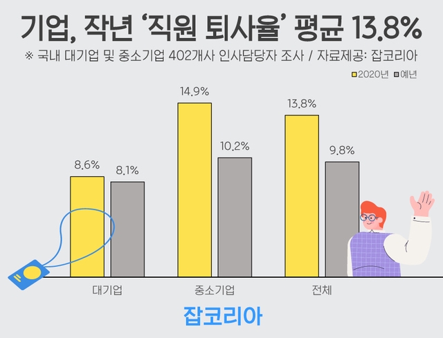 대기업의 퇴사율은 8.6%로 예년의 8.1%와 비슷했지만 중소기업은 14.9%로 예년의 10.2%에 비해 4.7%포인트 상승했다.