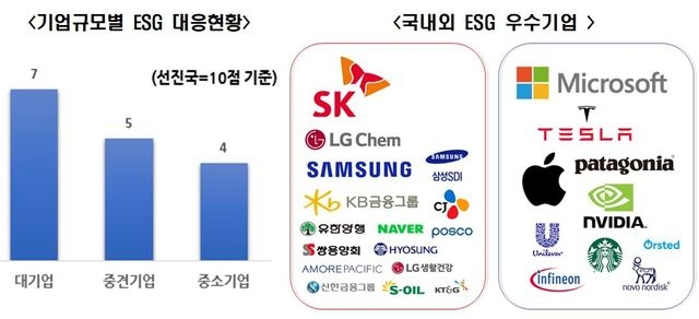 국내기업의 ESG 대응 수준에 대해서는 선진국을 10점으로 했을 때 대기업 7점, 중견기업 5점, 중소기업 4점 순이라고 응답했다.