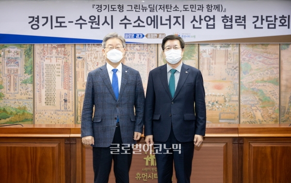 이미지 확대보기이재명 경기도지사는 수원시청에서 염태영 수원시장을 만나 ‘경기도-수원시 수소에너지 산업 협력 간담회’를 4일 가졌다.