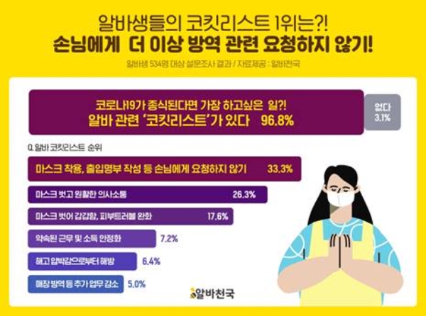 또, 96.8%는 코로나19가 종식되면 가장 하고 싶은 일을 말하는 이른바 ‘알바 코킷리스트’가 있다고 했다.