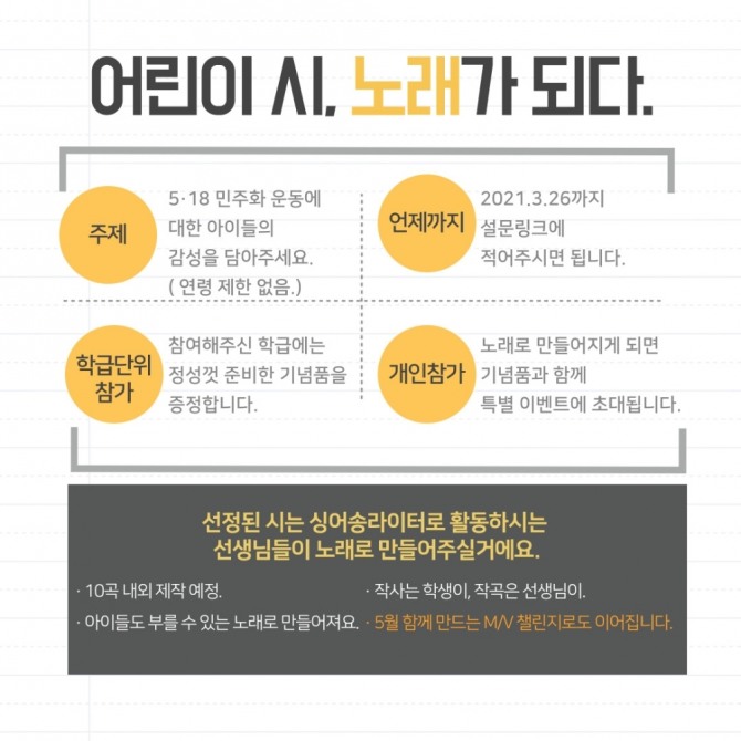 5·18민주화운동을 바라보는 아이들의 정서를 시로, 그것을 다시 노래로 만들어 보자는 의미로 시작한 ‘어린이 시, 노래가 되다’는 어린이뿐만 아니라 일반인들까지 누구나 참여할 수 있다.