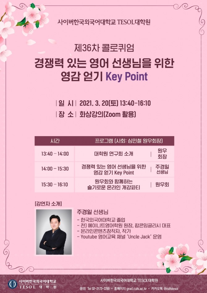 이번 콜로퀴엄 특강은 유튜브(Youtube)에서 영어교육 채널 ‘엉클 잭(Uncle Jack)’을 운영하는 주경일 강사가 맡았다. 주경일 강사는 메타버스 시대를 주도할 영어 선생님의 역할을 재정립하고, 경쟁력 있는 영어교육전문가가 되기 위한 노하우를 소개할 예정이다.
