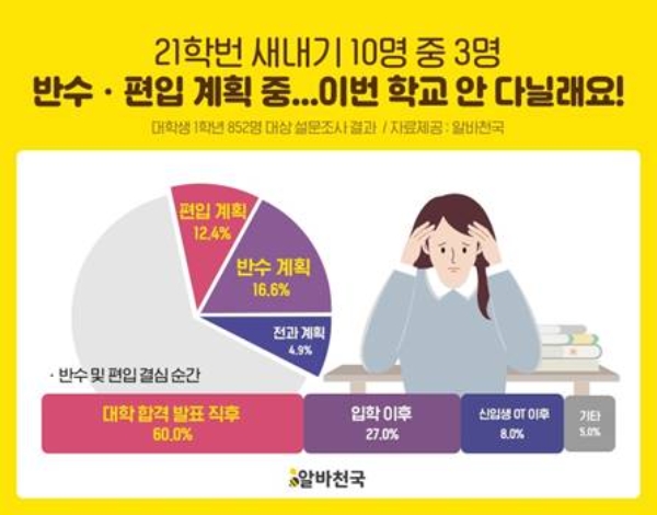 반수 및 편입을 결심한 시점은 ‘대학 합격 발표 직후’라는 응답이 60%, 입학 이후 27%, 신입생OT 이후 8% 등으로 조사됐다.